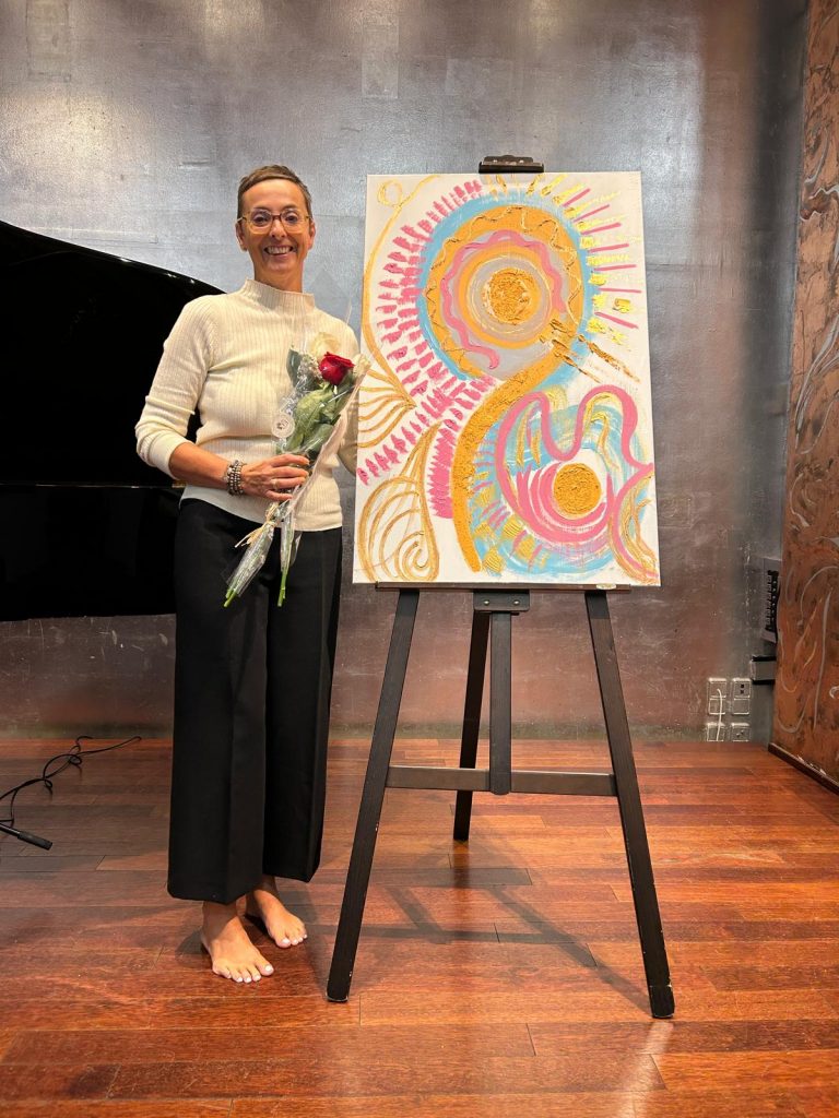 Desde las primeras notas, la música me envolvió por completo, sentí como vibraba dentro de mí, guiando cada movimiento, cada trazo y cada respiración. Mis manos comenzaron a danzar sobre el lienzo, como si una energía invisible las condujera, transformando el sonido en color, la emoción en forma y el silencio en presencia.